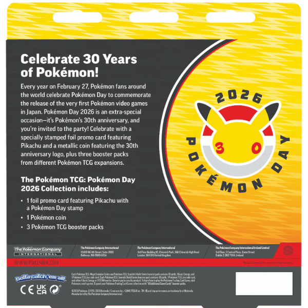 Pokémon Day 2026 is an extra-special occasion–it’s Pokémon’s 30th anniversary, and you’re invited to the party! Celebrate with a specially stamped foil promo card featuring Pikachu and a metallic coin featuring the 30th anniversary logo, plus three booster packs from different Pokémon TCG expansions.